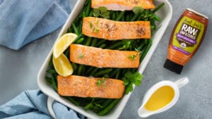 - Just before baking, place the green beans in the bowl that contains the honey mustard sauce. Using a large spoon, toss the green beans so they are evenly coated with the sauce. Arrange the beans on the opposite side of the salmon.