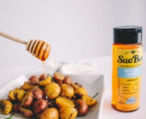 - Drizzle with Sue Bee® Sea Salt Honey; stir well to coat all potatoes.