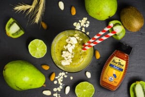 - 3. Slice kiwi fruit into halves and spoon fruit into the blender with the rest of the smoothie. Pulse until just blended.