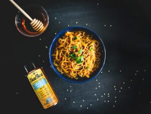 Add and stir: soy sauce, SUE BEE® Sea Salt Honey, olive oil, rice vinegar, Sriracha, ginger, and diced garlic clove.