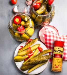 In a medium sauce pot, combine water, vinegar, hot honey, mustard seed, and Kosher salt. Bring to a low simmer, stirring until all ingredients (except mustard seed) are dissolved. Remove from heat and allow to cool.